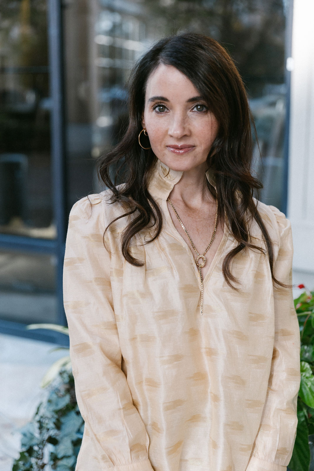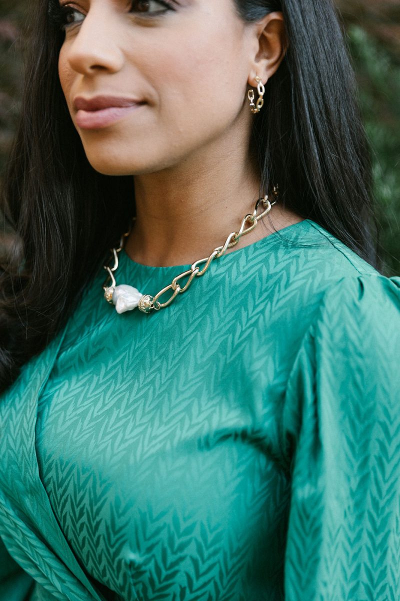 Nadia is wearing Shoshanna, with Karin Sultan jewelry