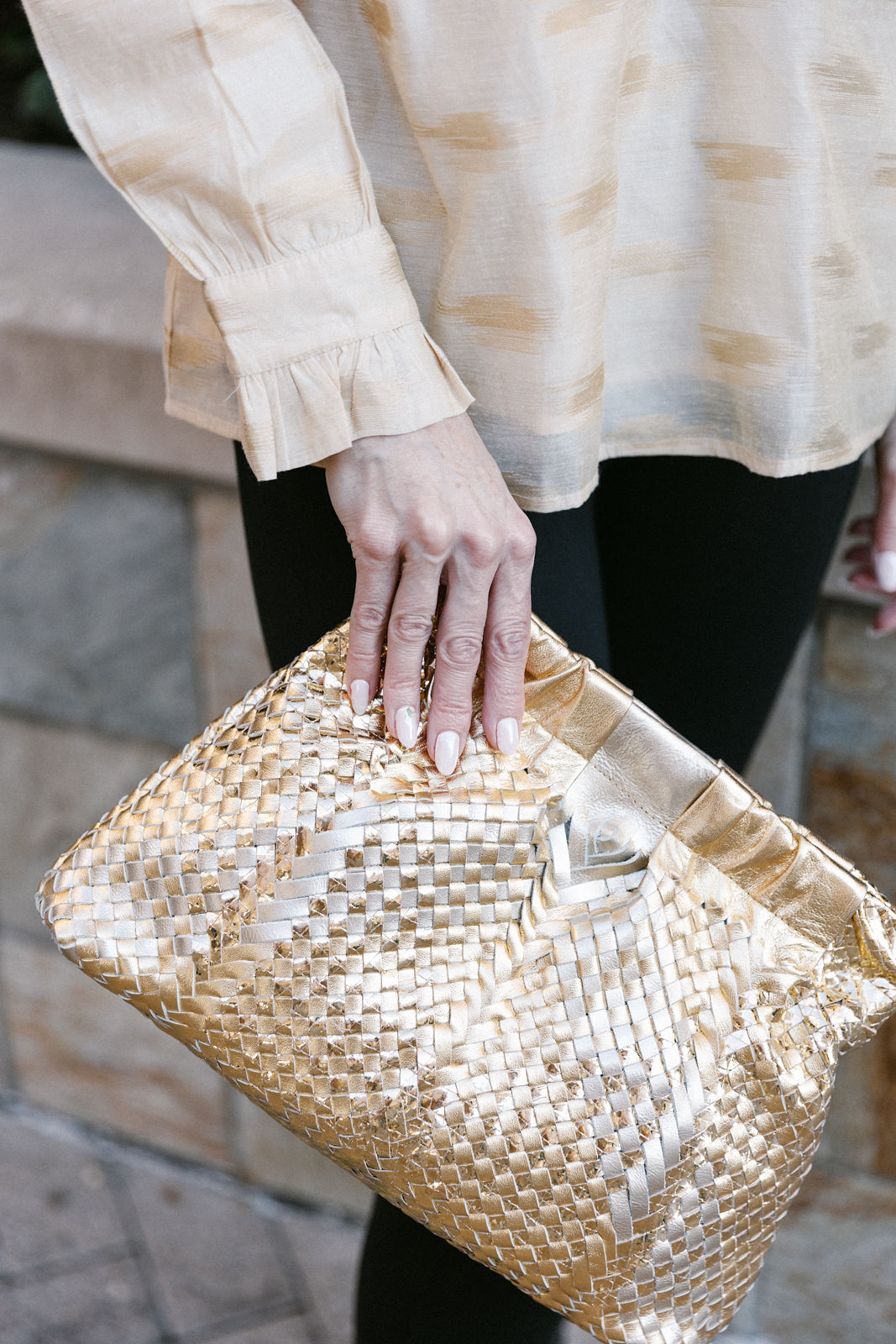 Laina pairs a CK Bradley top with Brochu Walker pants, Jennifer Zeuner jewelry and a gold Claramonte clutch