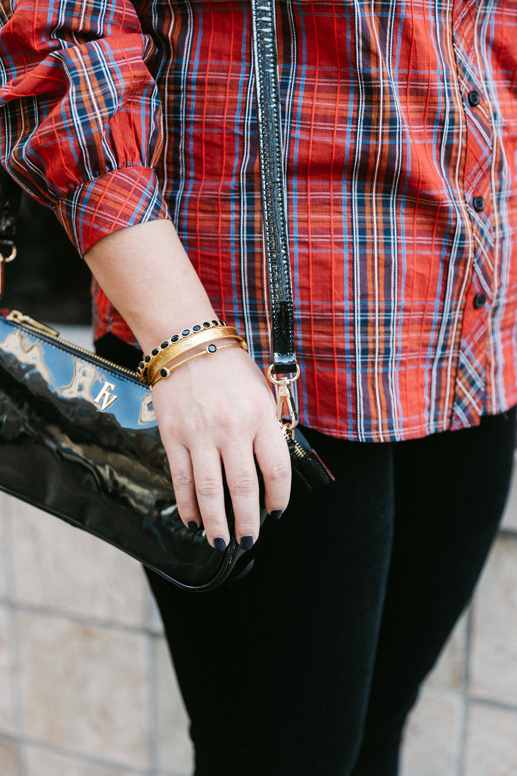 Nadia is wearing a Hunter Bell top and skirt with Julie Vos jewelry and a Frances Valentine bag