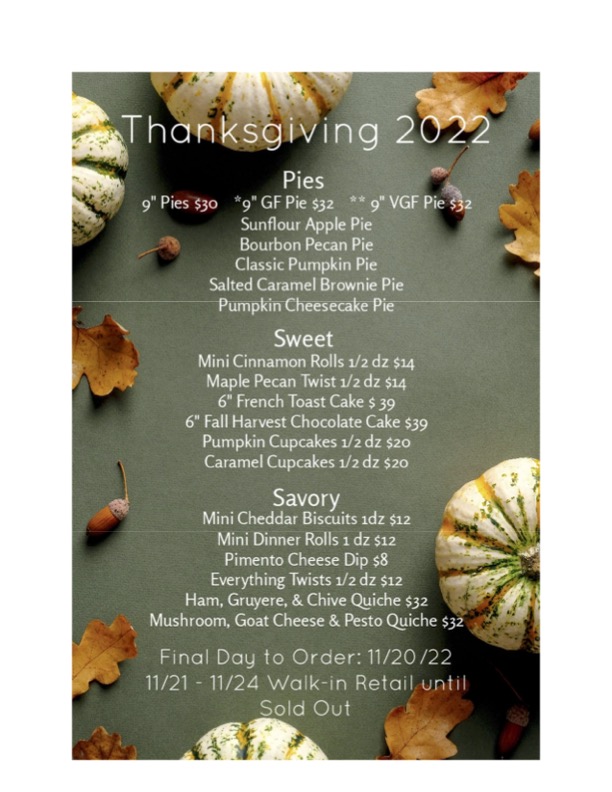Orders are open on the website www.thoughtfulbakingco.com now until Friday November 18th at 5pm with three different pick up options for Wednesday November 23.