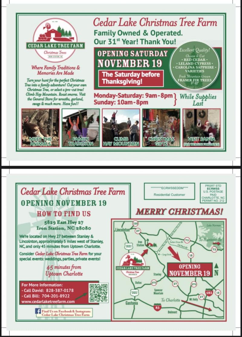• Mrs. Ruth’s Christmas Trees: 2206 Charlotte Hwy, Mooresville. Open Monday- Sunday 10a – 8p.