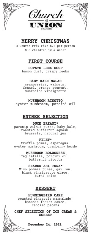 Serving a 3-course prix-fixe menu in addition to their regular menu, Church & Union’s Christmas Even meal is available from 12pm-9pm on December 24th, $80 per person | $30 children 12 & under.