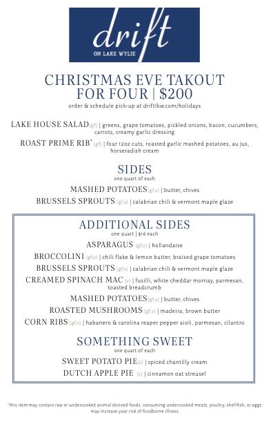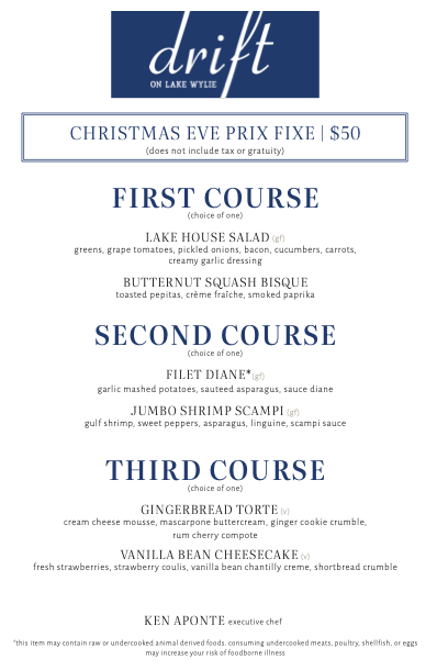 Drift on Lake Wylie Christmas Eve for Dine in & Take Out