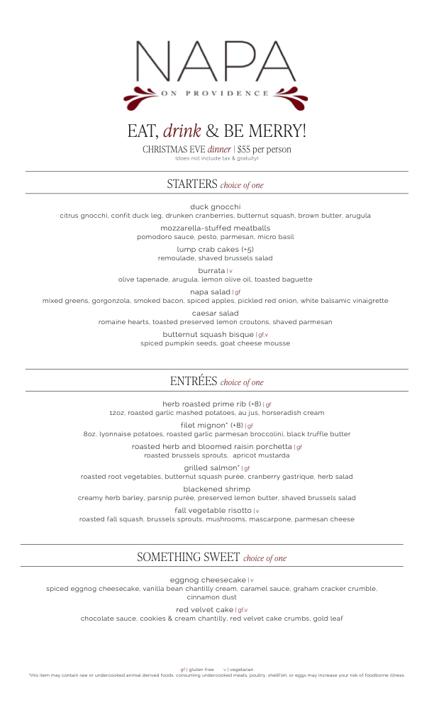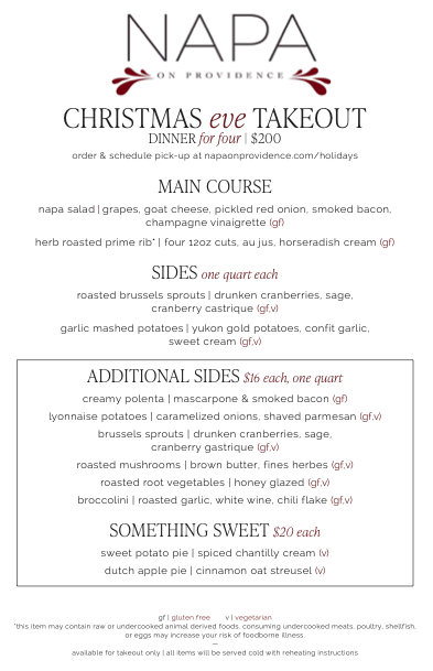 NAPA on Providence and NAPA at Kingsley for Christmas Eve Dine In or Take Out