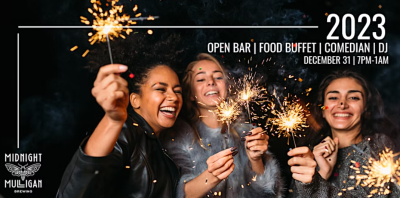 Join Midnight Mulligan’s Brewing for the ultimate New Year’s Eve celebration with no cover charge! The night will start with DJ LG at 7 p.m., followed by comedy hosted by Chris Corrado at 8:30 p.m. and a champagne toast at midnight.