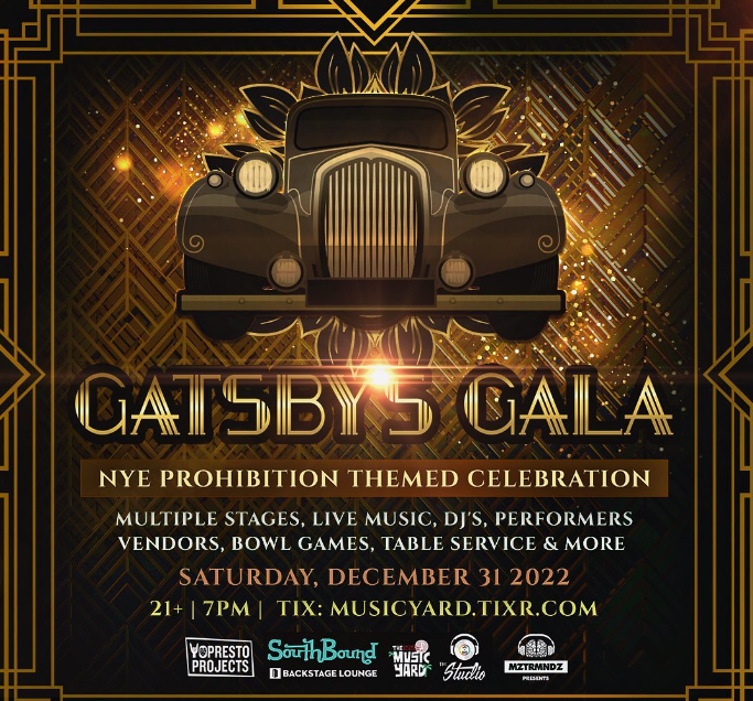 The Music Yard, Southbound, and Backstage Lounge will join in throwing the biggest roaring 20’s party around. The event will feature three stages, bands, DJs, performances, VIP Tables, vendors, college football games, and a free champagne toast & hors d’oeuvres for VIP buyers. Don’t forget to dress to impress!