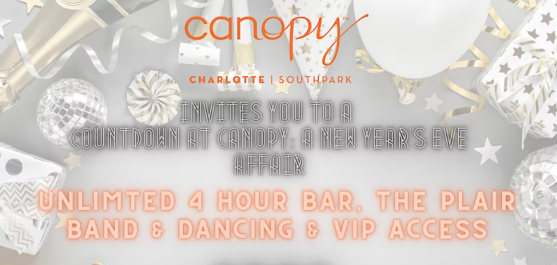Countdown the New Year at Canopy SouthPark for a night filled with dancing, celebrating, drinks, and a live band. The Ultimate VIP Package includes appetizers, access to a four hour premium bar, and champagne toast at midnight.