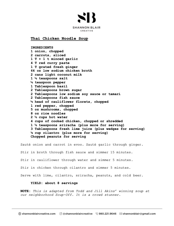 Not so creative in the kitchen? A savvy way to gather fresh ideas for old standbys is to host a soup-off, similar to a chili cook off but with, well, soups. This Thai version of classic chicken soup is my adaptation of the winning recipe from a “Soup-Off” I once hosted.