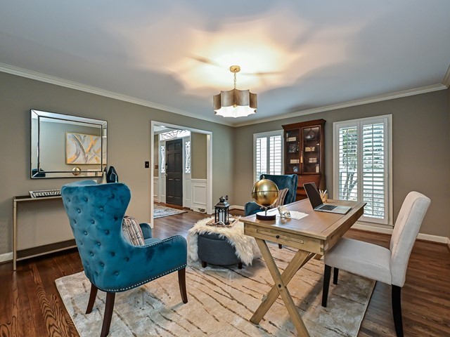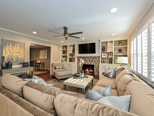 The dining room provides a bump out space for an extended table, and the living room/study provides direct access to the family room with built-ins and gas log fireplace.