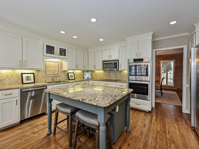 The renovated kitchen and breakfast room are large and open with a center island, granite counter tops, top of the line stainless steel appliances, and numerous other amenities.
