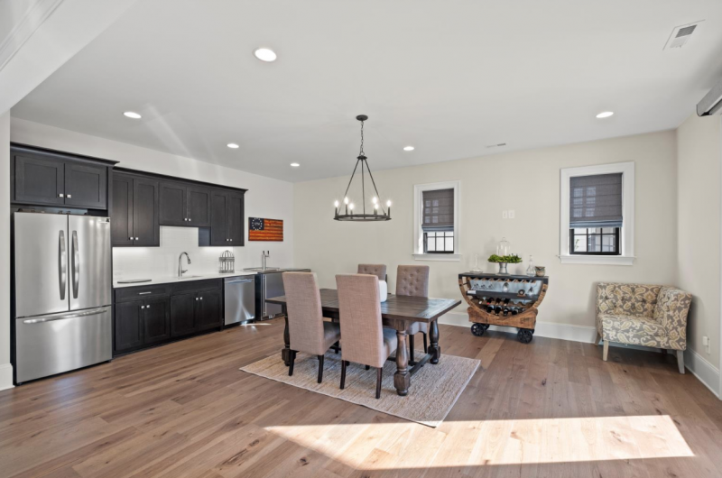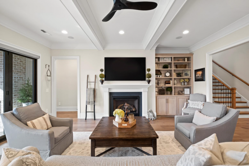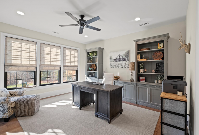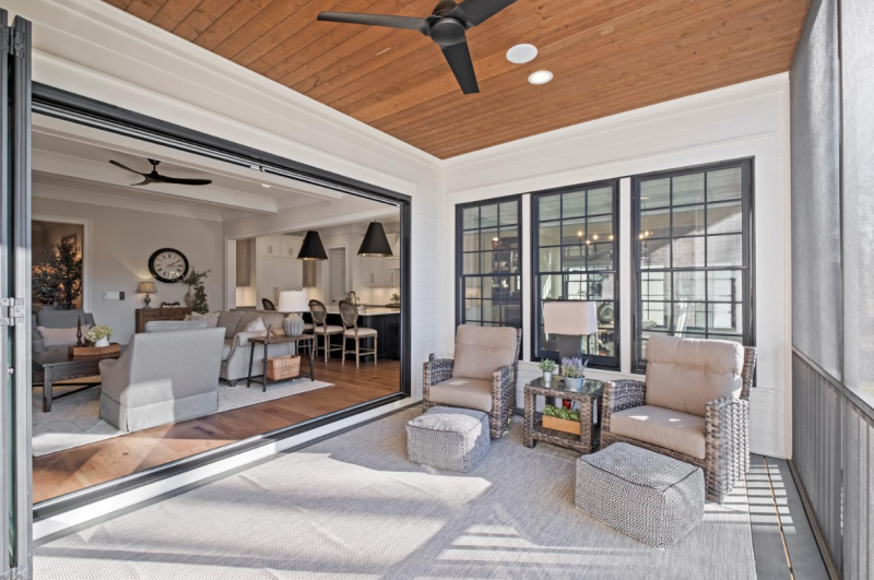 The Great Room features lovely built-ins and a 12′ accordion door which opens to a screened in porch with a fireplace – perfect for indoor/outdoor entertaining.