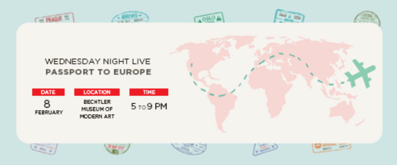 Travel abroad with the Bechtler through this special Wednesday Night Live “Passport to Europe ” edition. Experience this FREE first-class journey learning about the diverse European influences that inspired the paintings, prints, and sculptures found within the Bechtler collection. Grab your Passport to Europe and experience the wonder of the world through the lens of artists featured in the Bechtler galleries. As you travel throughout the museum, get your passport stamped. Once you’ve collected your stamps from all destinations, you will be entered to win a Bechtler prize pack.