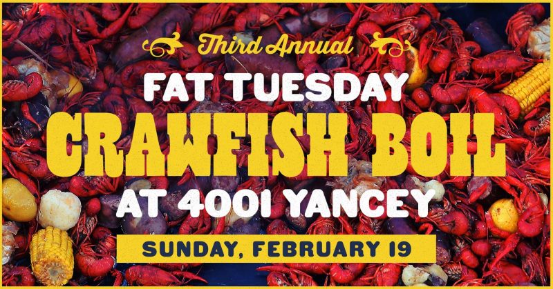 Just ahead of Mardi Gras, Brewers at 4001 Yancey will host their 3rd Annual Crawfish Boil with live music and crawfish specials all day long, specialty cocktails, and special King Cakes with prizes.