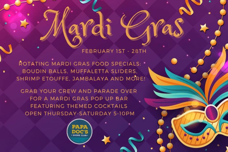 Papa Doc’s Shore Club is bringing all the sights, sounds, and tastes of the Big Easy to the lake with their rotating Mardi Gras food specials and a themed cocktail menu, available all February long. Papa Doc’s Mardi Gras Pop-Up Bar will be open Thursday through Saturday, from 5 p.m. – 10 p.m.