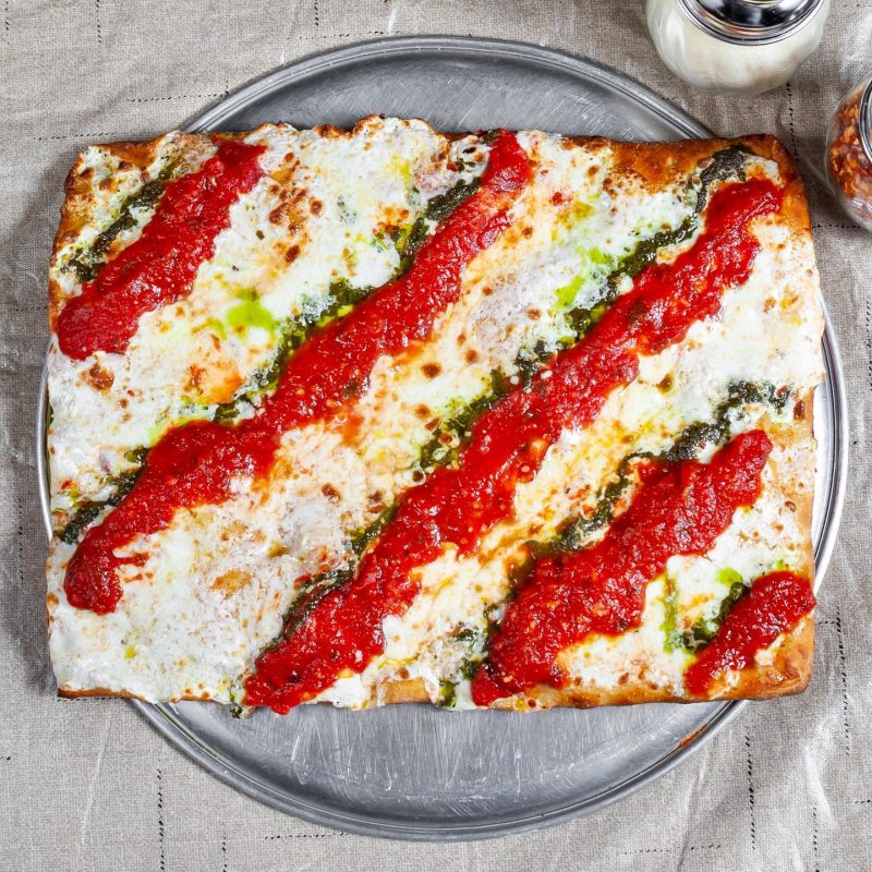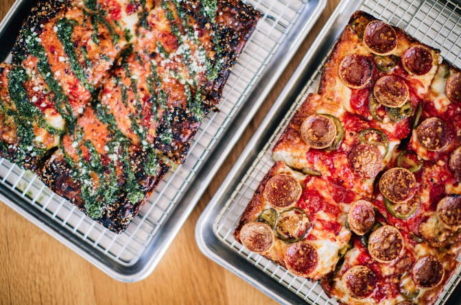 The Scoop: This small pizza chain originated from Brooklyn and is known for its unique, square-shaped, Detriot style pies. Made from quality ingredients and flavorful toppings, their signature style pizza has a crispy bottom, cheesy crust, and features their signature sauce stripes.