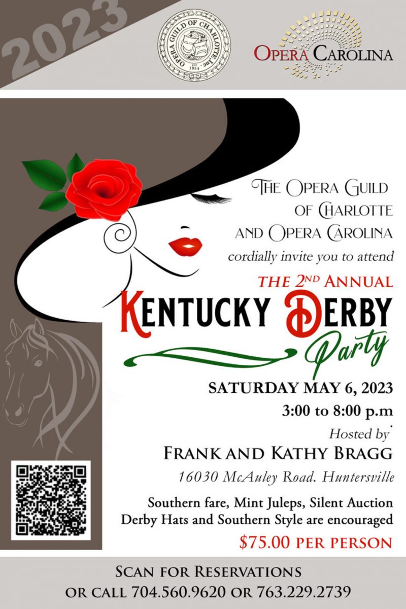 Join the Opera Guild of Charlotte and Opera Carolina for their 2nd Annual Kentucky Derby party. Expect the evening to be filled with Southern fare, Mint Juleps, a silent auction, derby hats, and Southern style. Tickets can be purchased here.