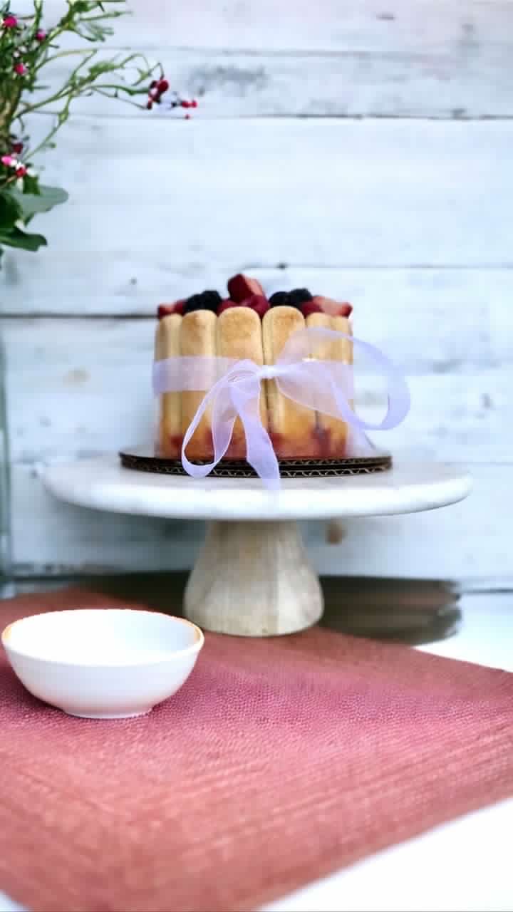 - 6″ Strawberry Charlotte- Lady Fingers filled with Strawberry white Chocolate Mousse filled
