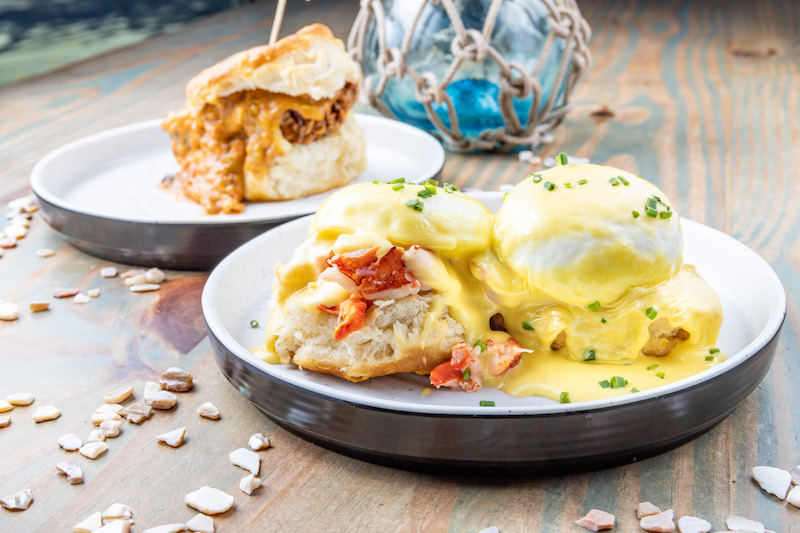 - Lobster Bene $19 – buttermilk biscuit, two poached eggs, butter-poached lobster, Waterman Hollandaise