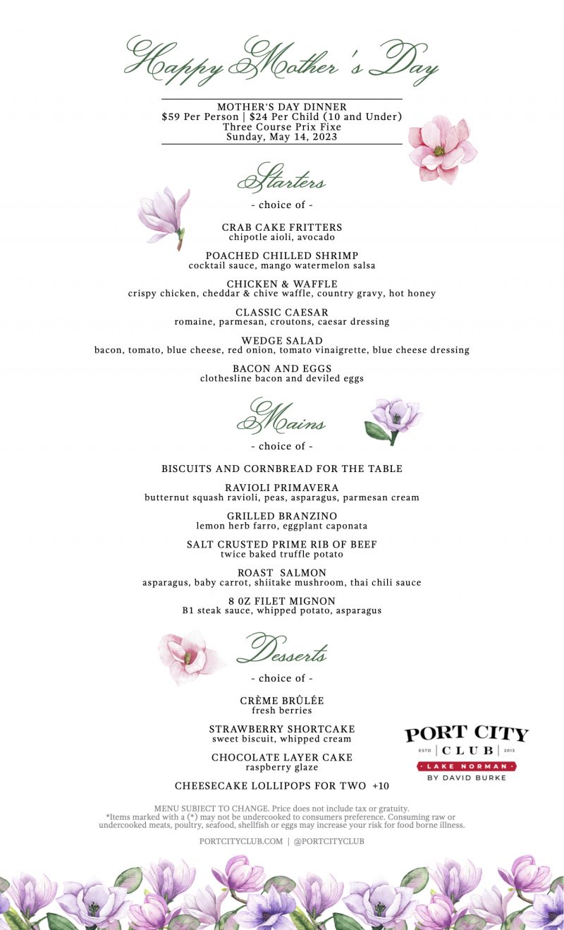 Dine on the waterfront at Lake Norman and celebrate Mom at Port City Club by David Burke with a Three Course Mother’s Day Dinner menu featuring over–the–top dishes, fare from land, sea and decadent desserts designed to make Mom happy. (brunch is sold out and dinner is getting tight).