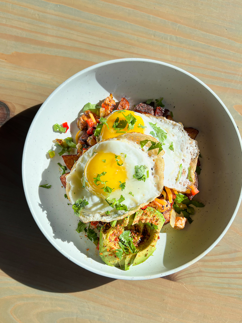 - Sausage & Salmon Hash $17 – andouille sausage, blackened salmon, red potatoes, peppers & onions, two sunny-side up eggs, cheddar cheese, cilantro, spiced avocado