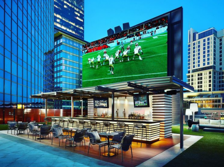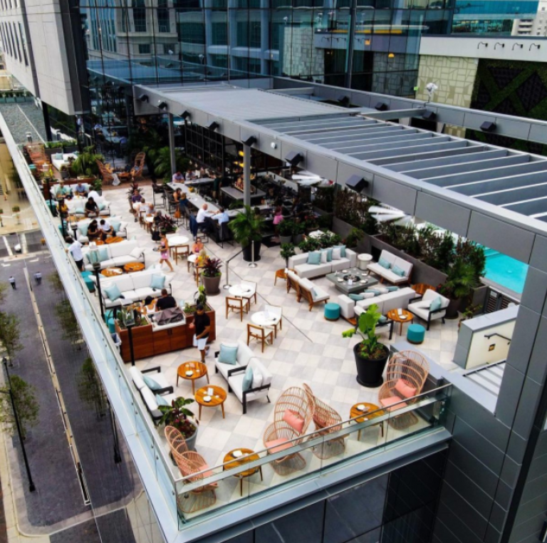 A large screen to watch games, a pool with poolside drink and food service, outdoor games, a live DJ, and impressive views of Uptown make the Coin Bar a go-to for summer hangs.