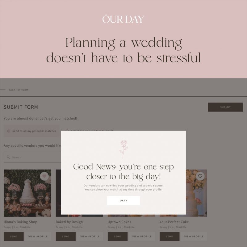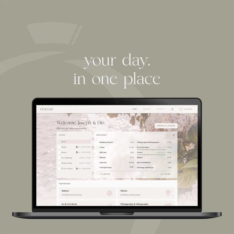Our Day is an innovative web-based platform made for couples to explore, compare, and match with their perfect wedding vendors. Everything needed to book a wedding is on the website one place: you can browse and contact local vendors; stay organized using budgeting and planning tools, keep track of requests and responses. With Our Day’s matching function, couples no longer need to research and contact individual vendors for quotes and information. You’ll set up your profile, select the types of services you are requesting info on, and your requests are matched to the appropriate vendors, who provide you direct quotes to choose from.