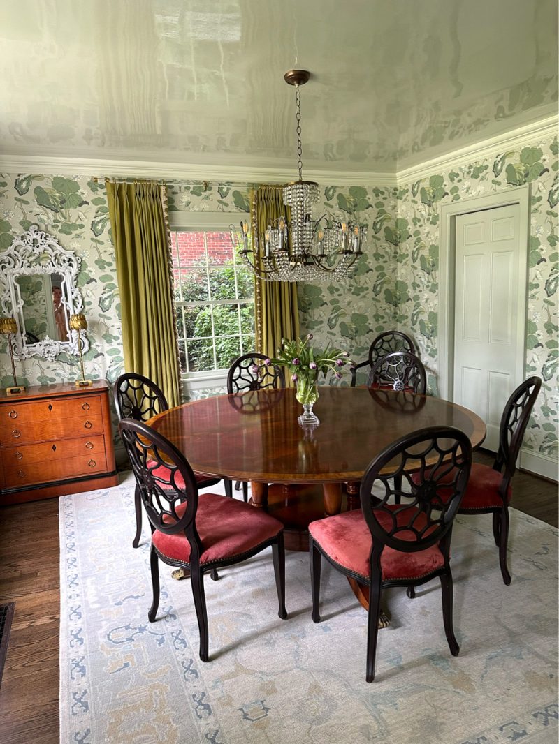 The ceiling was painted with Fine Paints of Europe (a lacquer finish, that takes many coats) to match the background of the wallpaper we added. This paint finishing process is very labor intensive and can cost 3-5 times what a typical paint project would be (of similar scope and size)