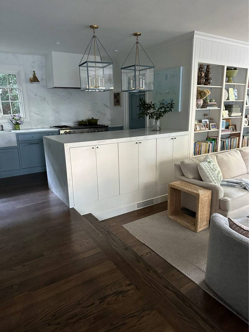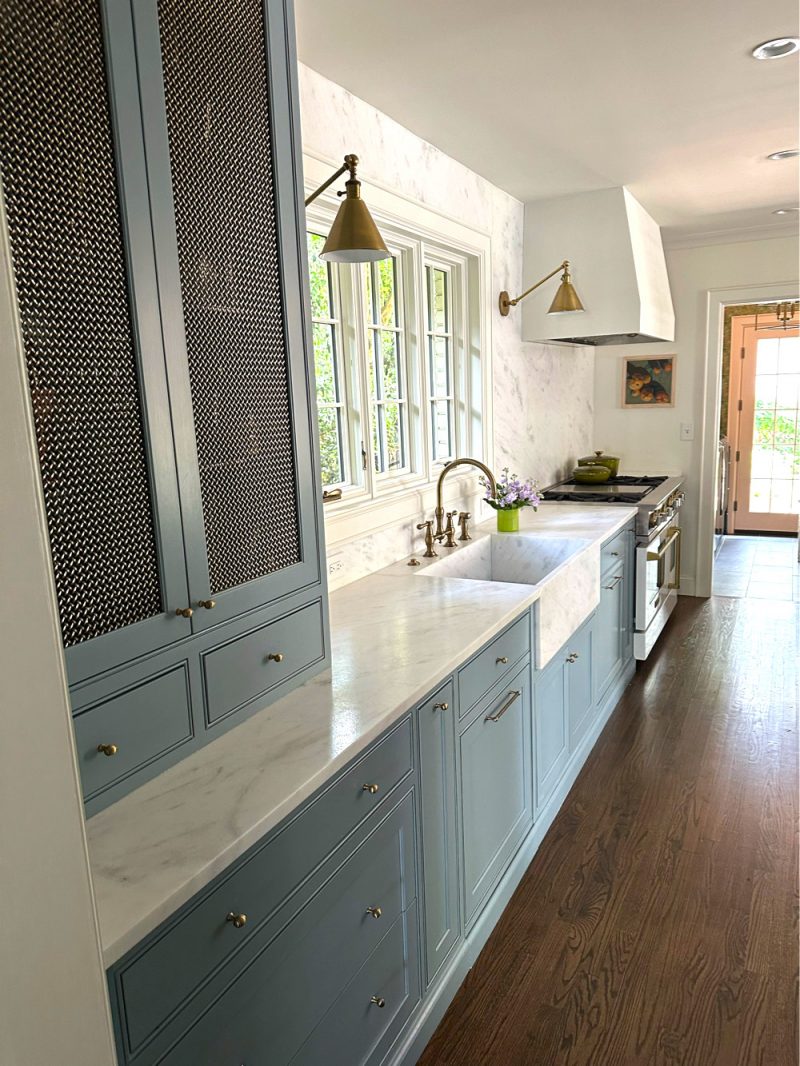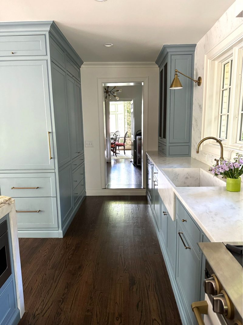 The Kitchen and Family Room were open to each other, the kitchen being a long galley T shape. It was awkward and dark, and it had to go. We took it down to the studs. Cabinets were custom built and painted Benjamin Moore Van Courtland Blue (less 25%). Countertops, sink and backsplash are Bianca Olinda marble with a leathered finish. A kitchen renovation with similar finishes and appliances can potentially run north of 150k.