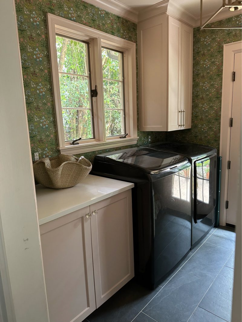 The floors were replaced with slate tile. Custom cabinets built and painted in Sherwin Williams Malted Milk (as well as trim and ceiling). Wallpaper hung and blinds out! A Laundry Room flip similar to this will run around 20k.