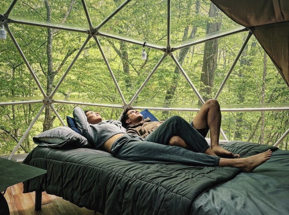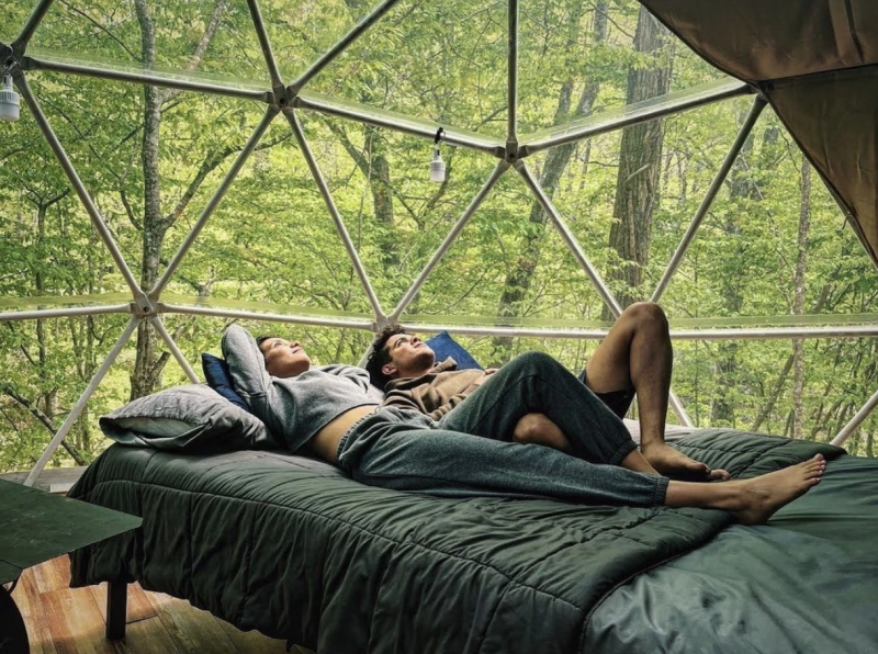 An eco-friendly, minimal footprint lifestyle in one of their five Geodesic Dome or their “Tiny AF” (A-frame for two).