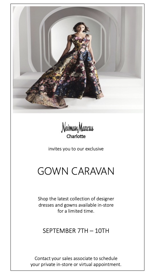 Also on September 7th at NM, their fab GOWN CARAVAN trunk show kicks off where you can shop beaucoup fall & winter gowns at a variety of price points. Show runs through 9.10.23