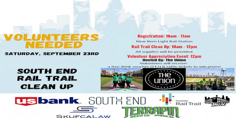 Come clean up the Rail Trail in South End! Registration begins at 10 a.m. at the New Bern Light Rail Station with the cleanup being from 10 a.m. to noon. All cleaning supplies will be provided by Keep Charlotte Beautiful. Following the Clean Up, The Union will host a Volunteer Appreciation Event, beginning at 12 p.m., to celebrate all of our volunteers’ efforts and raffle off prizes from 30+ local business sponsors. Volunteers (21+) will receive a FREE drink ticket courtesy of South End Social to use at The Union, along with raffle tickets for 30+ prizes courtesy of their sponsors. The first 100 Volunteers will also receive a custom event drawstring bag with giveaway items.