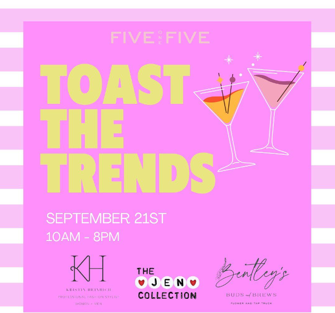 Mark your calendars! Come toast the trends with Five One Five featuring local stylist Kristin Heinrich, the Jen Collection, and Bentley’s Buds and Brews flower truck. There will be giveaways and lots of fun prizes to win, a styling session, and more goodies!