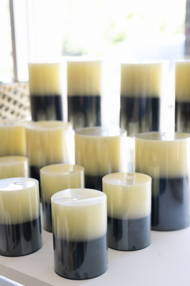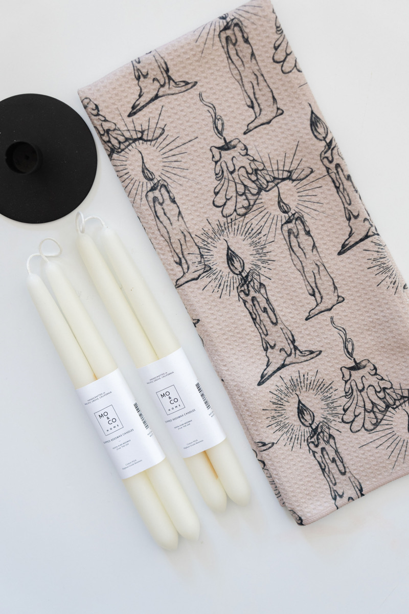 Taper candles, holders, and seasonal tea towels (available in-store).