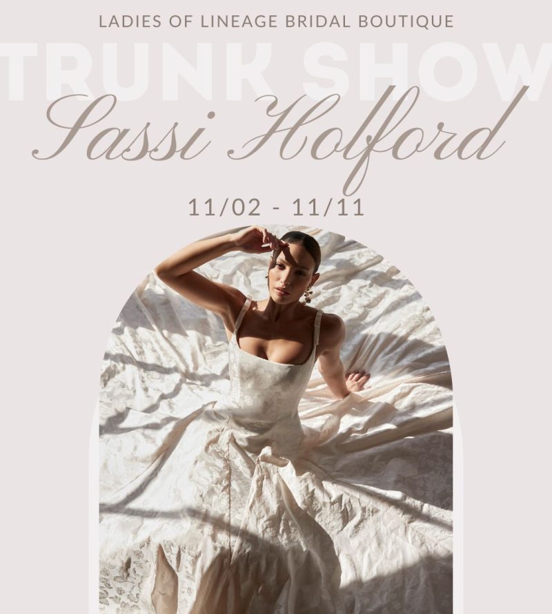 - 11/02 – 11/11 Sassi Holford Trunk Show Sassi Holford’s Harmony Fall ’24 collection is uncompromising in its embrace of the splendor of the wedding gown. Every design intentional; every detail rich with Sassi’s instinctive ability to harmonize luxurious fabrics with confident and nostalgic silhouettes. Contemporary, yet traditional, the collection combines nipped waists and striking necklines that frame the face and collar bone to make a memorable look. Classic duchess, beautiful jacquards, and sheer textured fabrics are an ode to the legacy of the wedding dress.