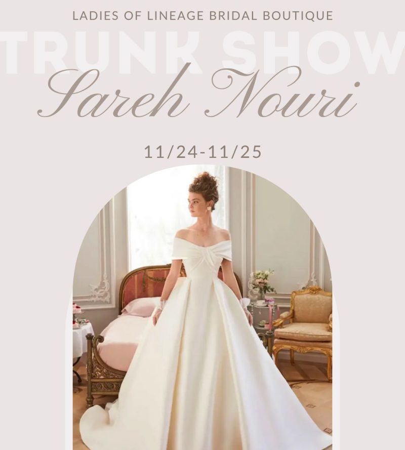 - 11/24 – 11/25 Sareh Nouri Fall ’24 Trunk Show The Love, Sareh Fall ’24 Collection by Sareh Nouri celebrates the timeless beauty infused with a touch of grown-up whimsy. Every piece designed with shapes and details that embrace the little girl inside us all—the one who yearns for enchantment and romance in the embark towards forever love and lifelong commitment. Prepare to be captivated by Sareh’s latest collection, where elegance meets modern charm. Timeless and exquisite, Sareh Nouri’s wedding gowns feature the delicate beauty of French lace, couture bows, and pops of color, adding a touch of romance to your special day.