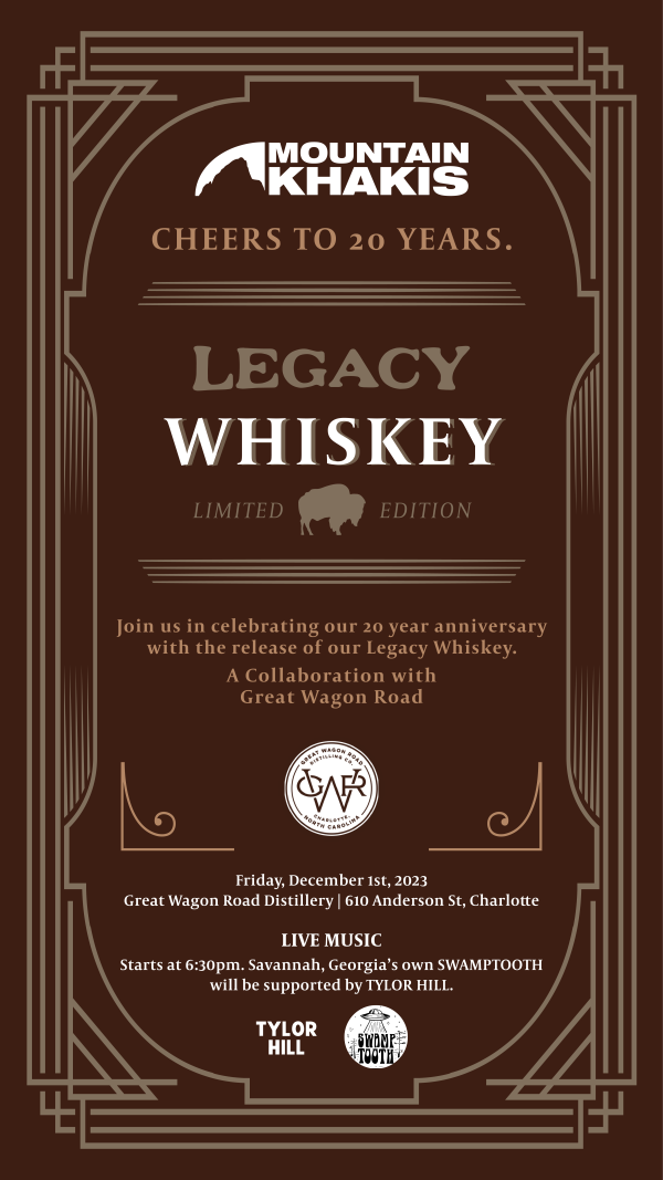 Join Charlotte’s oldest distillery, Great Wagon Road Distilling Company, and Mountain Khakis for a special release of their collaboration Legacy Whiskey on Friday. Featuring live music and special tastings of the all new Legacy Whiskey at Great Wagon Road Distilling Co., 610 Anderson Street. RSVP HERE
