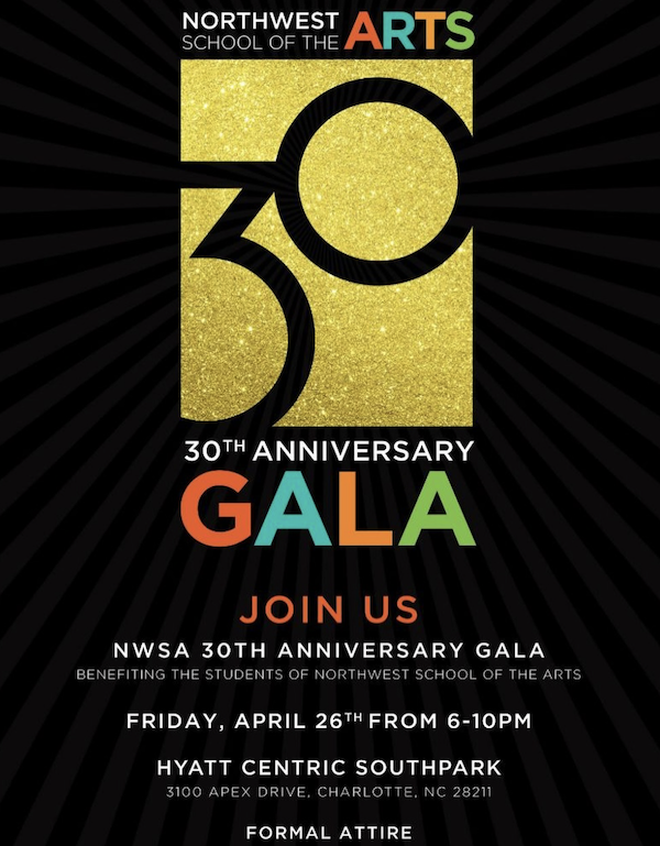 An anniversary gala and silent auction to fundraise for the emerging visual and performing arts students at Northwest School of the Arts. FRIDAY, APRIL 26 6–10PM at the HYATT CENTRIC CHARLOTTE SOUTHPARK.