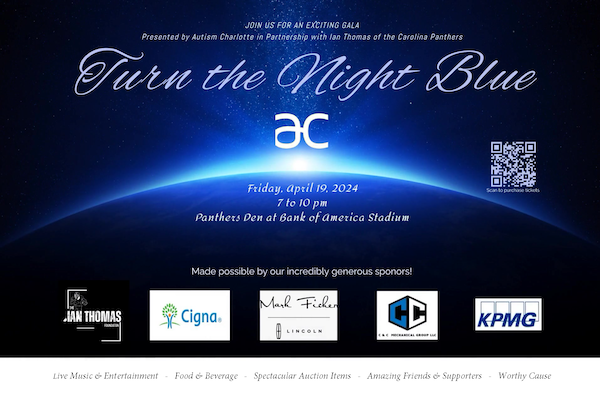 Join Autism Charlotte, Ian Thomas of the Carolina Panthers, and their friends in Panthers Den at Bank of America Stadium on April 19th to Turn the Night Blue! Autism Charlotte’s mission is to embrace and empower children and families affected by autism and has served thousands of children since 2006. The evening will include live music and entertainment, food and beverage, silent auction, and a live auction too.