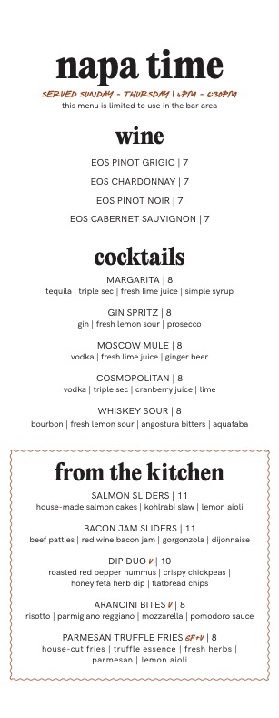 NAPA Restaurants on Providence Road and NAPA Kingsley have “Napa Time” daily wine, cocktail and eats specials on Sundays thru Thursdays, from 4 pm to 6:30 pm