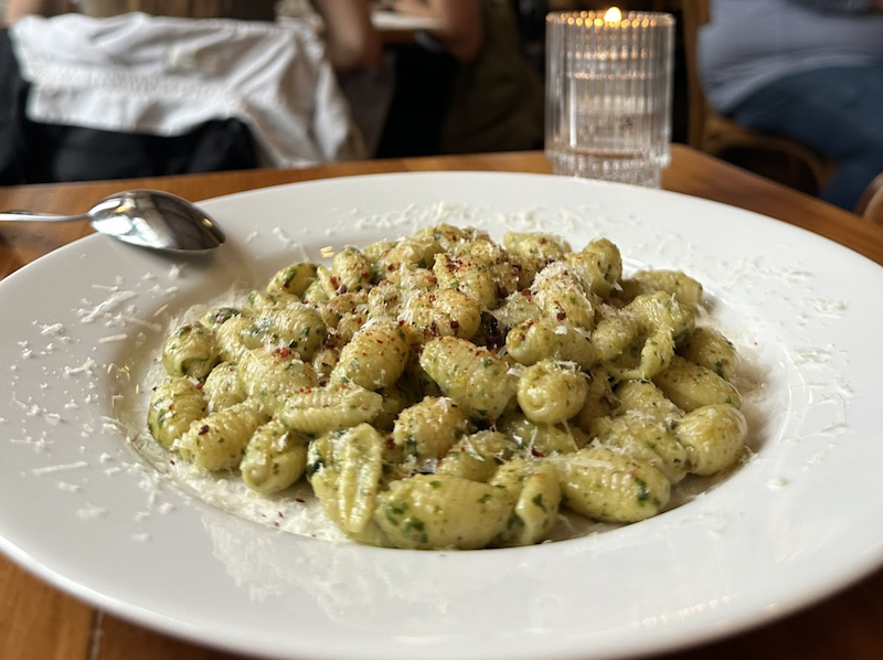 Vern’s | On the corner of Bogard and Ashe, you’ll find a neighborhood restaurant delicious enough to grace the New York Times 50 Best Restaurants in the United States list in 2023. Executive Chef Dano Heinze, a James Beard semifinalist for Best Chef: Southeast 2023, alongside his wife Bethany, offers patrons familiar yet innovative modern American cuisine. I still dream of the gnocchetti sardi, served with walnut arugula pesto, pictured below. Reservations, Thursday-Monday 5:00-10:00 pm, are available 30 days in advance via Resy.