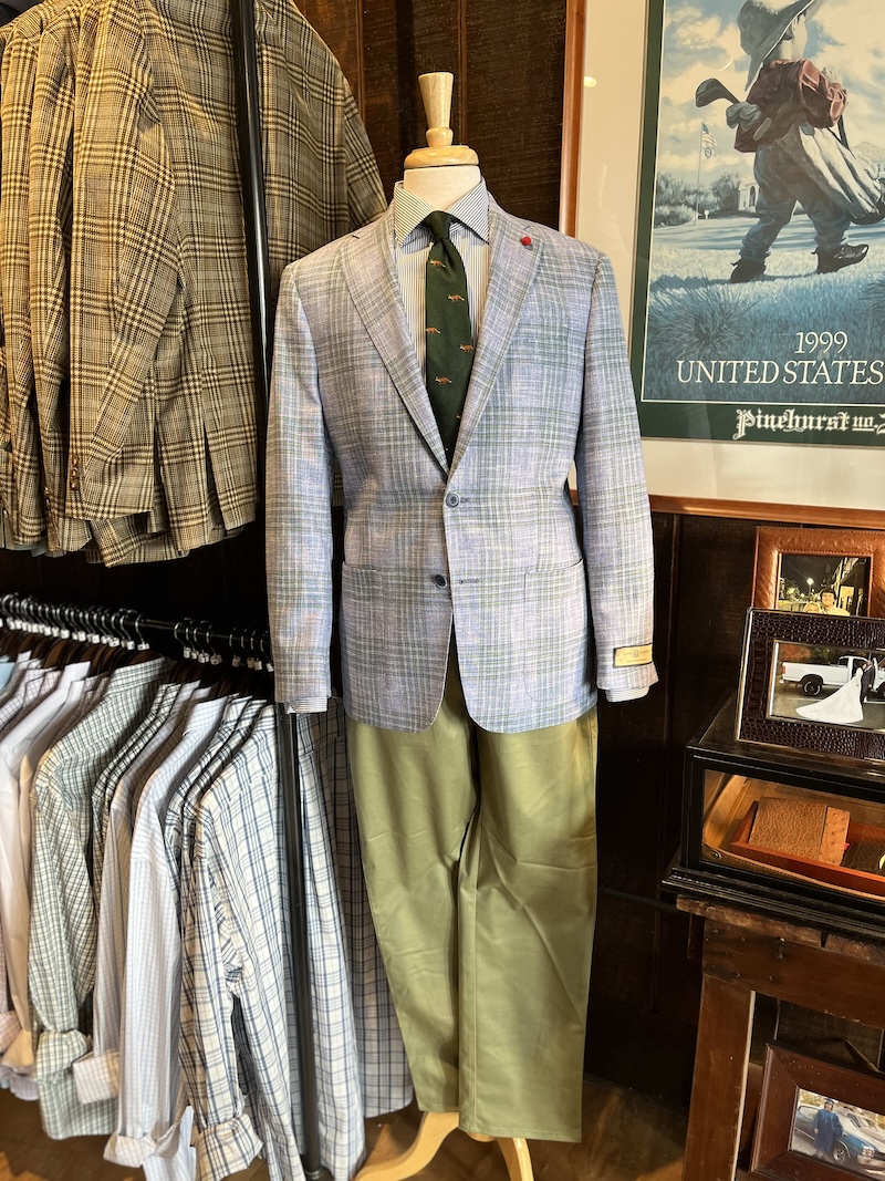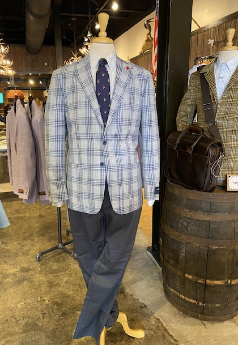 Barbera Clearwater Plaid Sport Coat – This spring and summer weight sport coat is made of a blend of wool, cotton, and silk for the best combination of shape, comfort, color, and drape.  It is paired with City Chino pants in Oil Green and True Navy/White Stripe Tailored Fit Spread Collar Shirt.