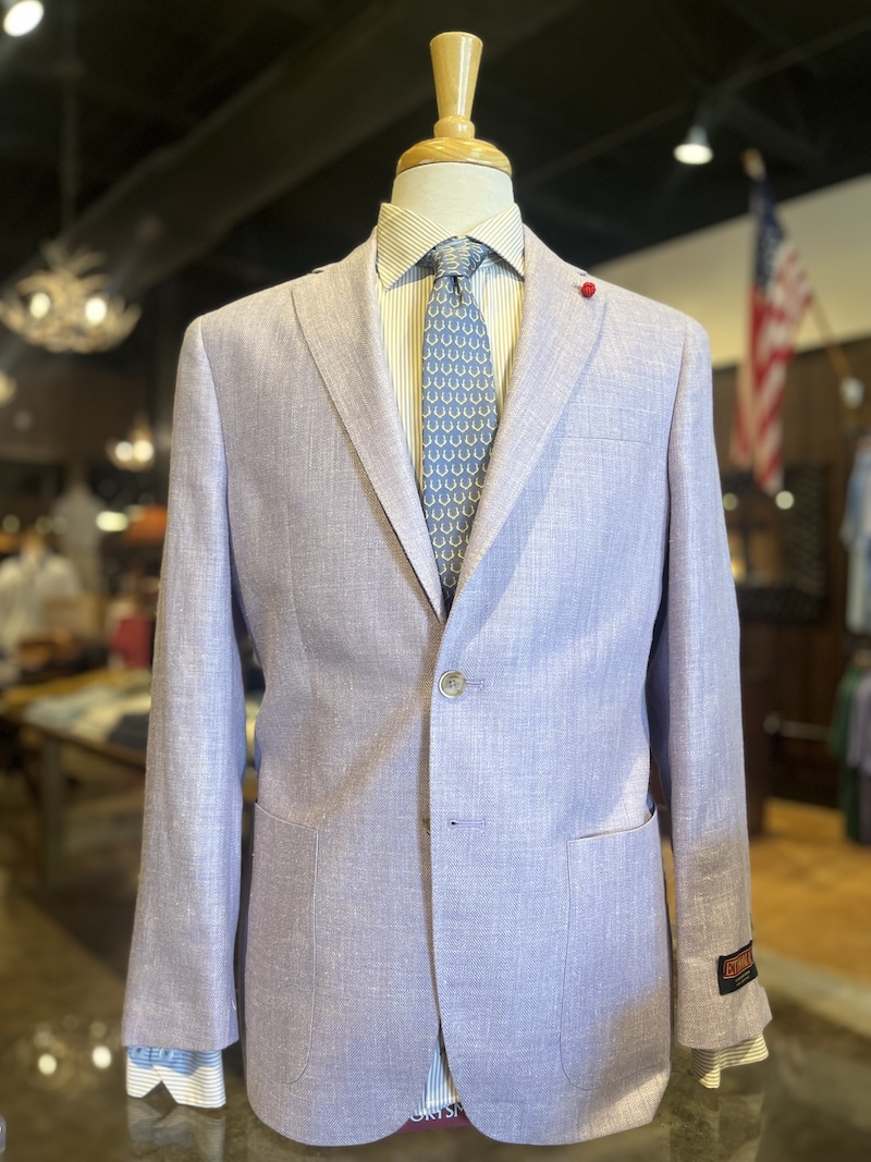 E Thomas Thistle Solid Sport Coat is a silk and linen blend that is perfect for Easter in a happy pastel color. We have it paired with a Dune/White Stripe Tailored Fit Spread Collar Shirt.