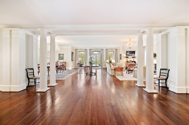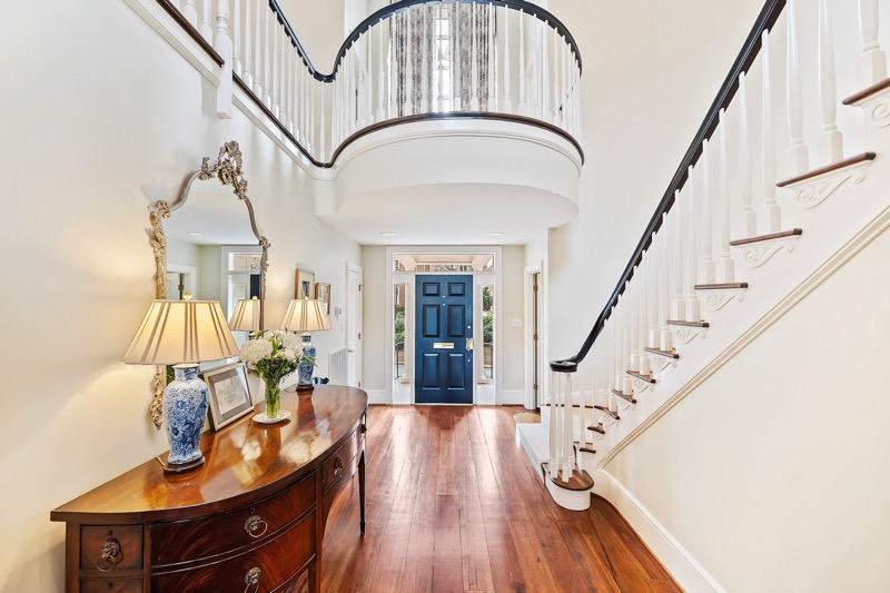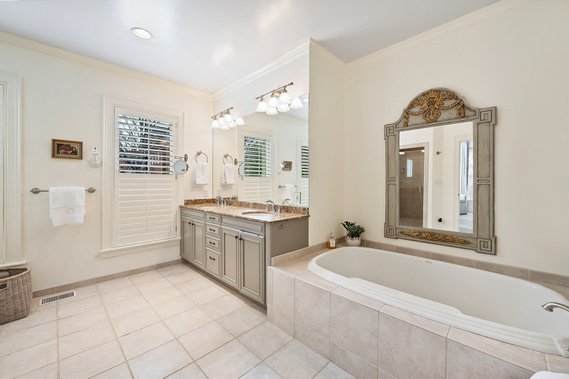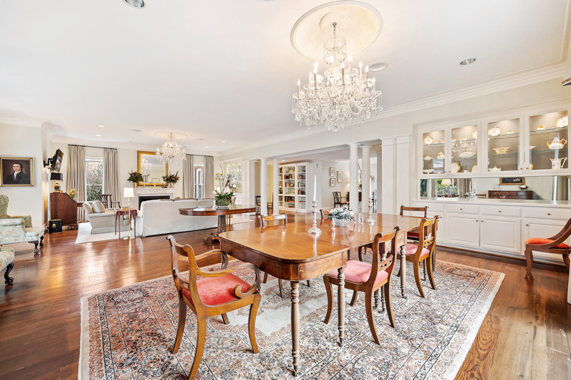 As you step into the grand foyer, you’ll be greeted by elegant appointments and open formal areas adorned with custom built-in bookcases and a wet bar.