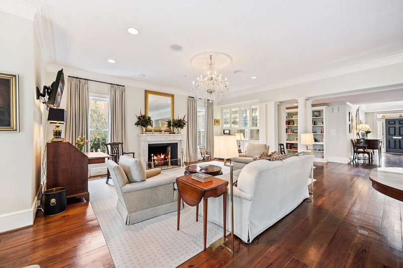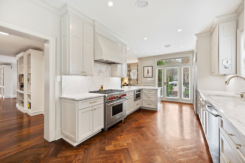 The renovated kitchen is a chef’s dream w/top-of-the-line appliances including a Wolf gas cooktop, marble countertops, and an eat-in island that opens to a cozy den.