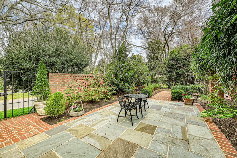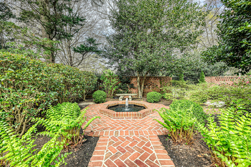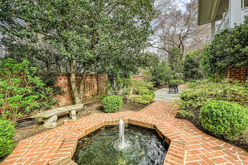 A fenced & private Charleston inspired garden awaits, complete with a slate patio, landscape lighting, brick walkways, fountain, & iron gate leading to Queens Rd. West.