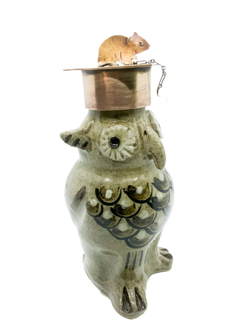Animal Jar Pam Owens/Jennie Keats BUY HERE $260.00. This piece features a handmade pottery owl (Pam Owens) with a handmade brass graduation cap (Jennie Keatts).