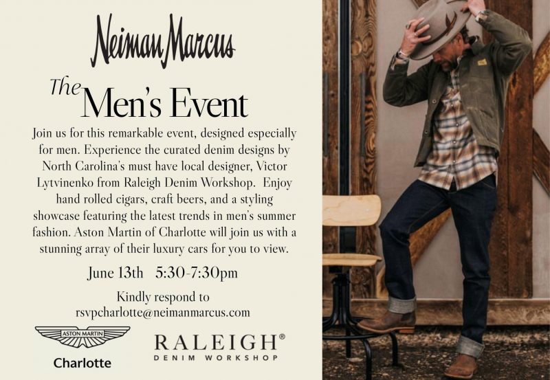 Join Neiman Marcus Charlotte for an event designed especially for men. Enjoy designs from Victor Lytvinenko, hand-rolled cigars, craft beers, and a styling showcase featuring the latest men’s summer trends. Aston Martin of Charlotte will also be there with luxury cars for you to view! RSVP by emailing rsvpcharlotte@neimanmarcus.com