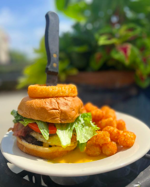 At State of Confusion sit outside on the patio or rooftop and try the House Burger with house ground beef, Swiss-American cheese, sharp cheddar, peppercorn mayo, lettuce, house pickles and tomato. Or, opt for the Over-Easy Burger with house-ground beef, fried egg, bacon, sharp cheddar, Swiss-American cheese and peppercorn mayo. And you can swap either patty out for a Bison burger as another delicious option.