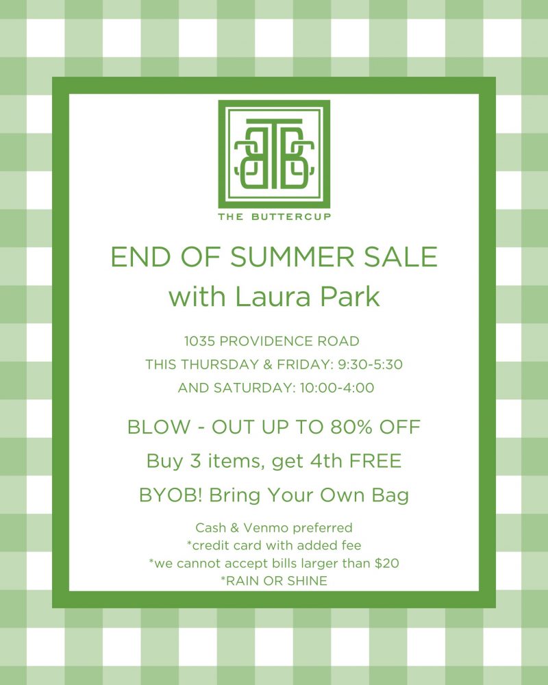 The Buttercup Shop and neighboring store Laura Park in the Myers Park shopping center at Providence and Providence Rds (: are hosting a MAJOR tent sale Thursday through Saturday Aug 8-10, with up to 80% off items.
